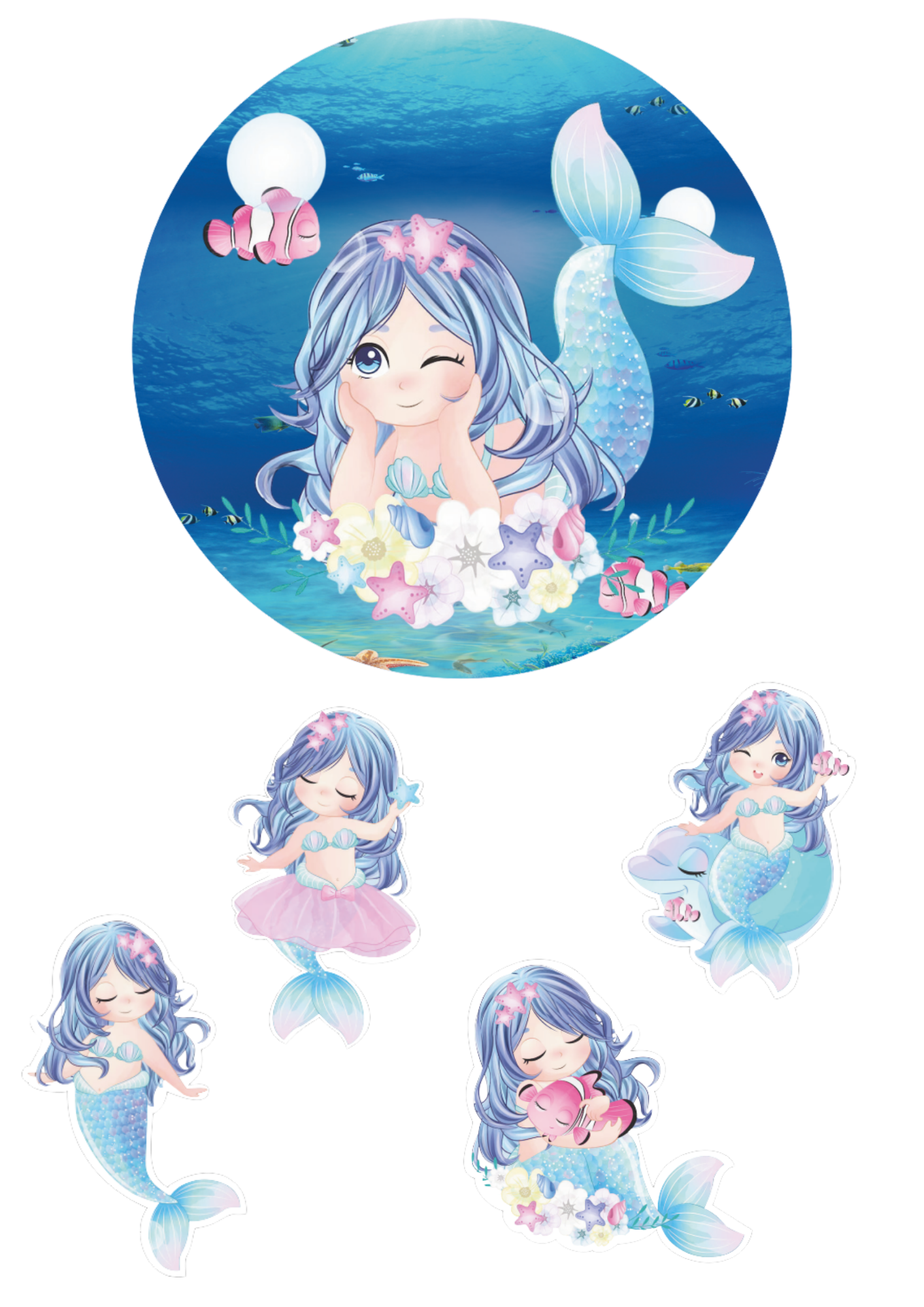 Yenilebilir Yuvarlak Pasta ve Figür Resim Baskısı Şekerli Kağıt Deniz Kızı Temalı 06